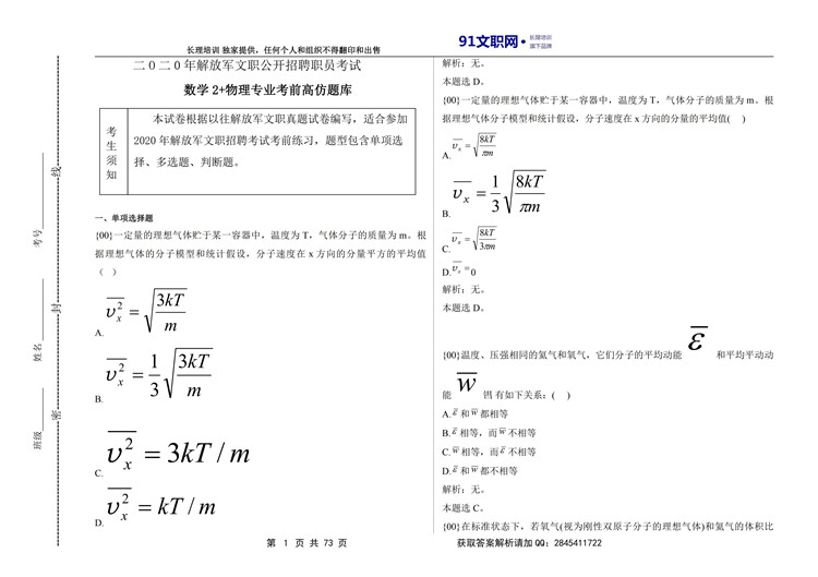 八、解放军文职考试理工学类专业——数学2+物理讲义及模拟题