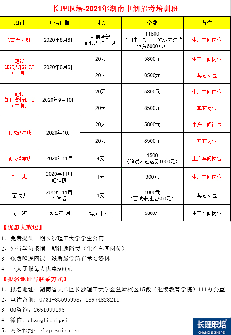 长理职培-2021年湖南中烟招考培训知识点精讲班(一期)已于2020年8月6日开课,很多同学因各种原因还没有来得及参加。长理职培特别推出增开二期知识点精讲班,欢迎各位考生咨询:0731-83595998,18974828211,QQ2651099195。